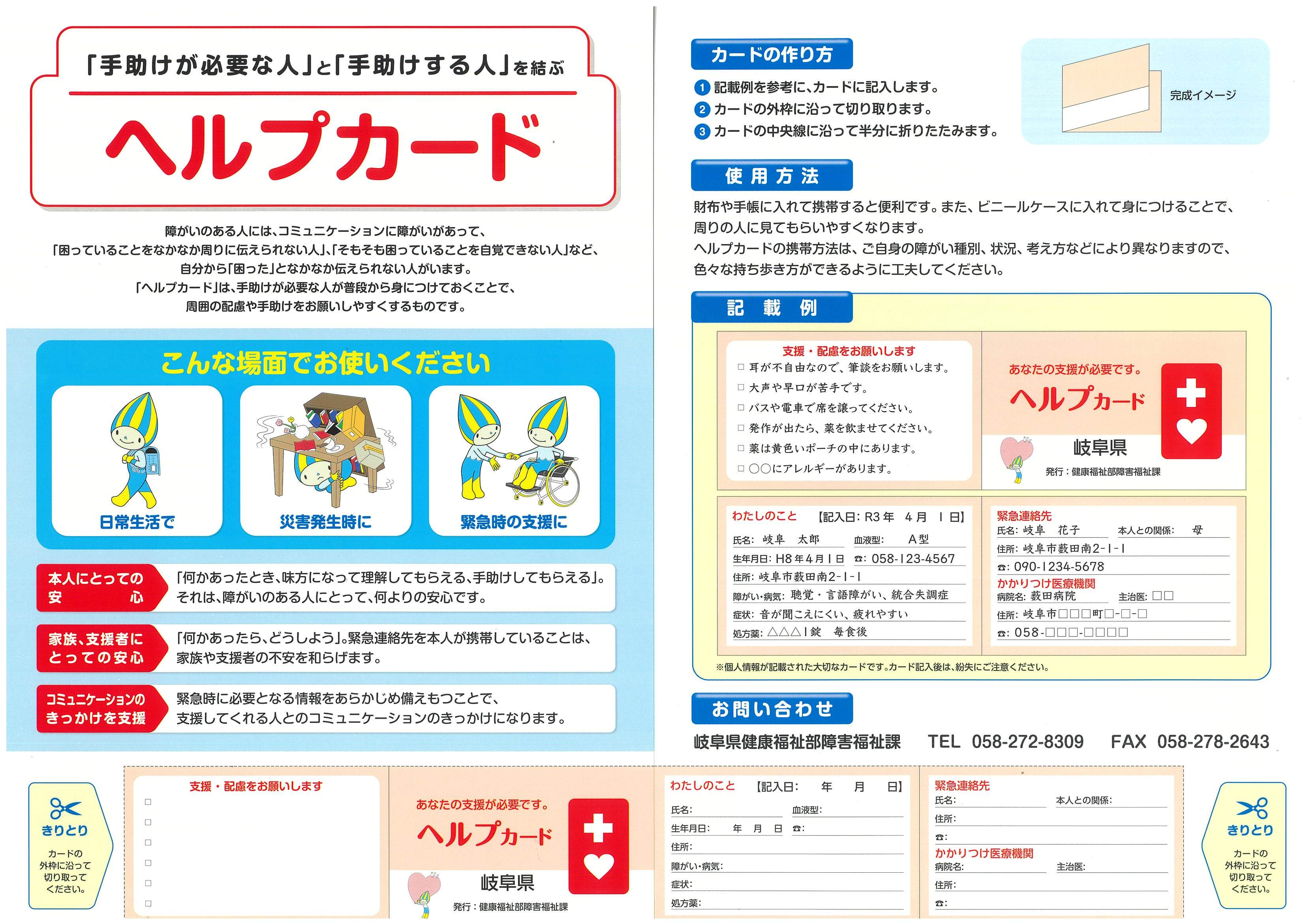 岐阜県では、「岐阜県障がいのある人もない人も共に生きる清流の国づくり条例」の施行を踏まえ、「人にやさしい岐阜県づくり」の一環としてヘルプマーク・ヘルプカードを導入し、配布しています。
