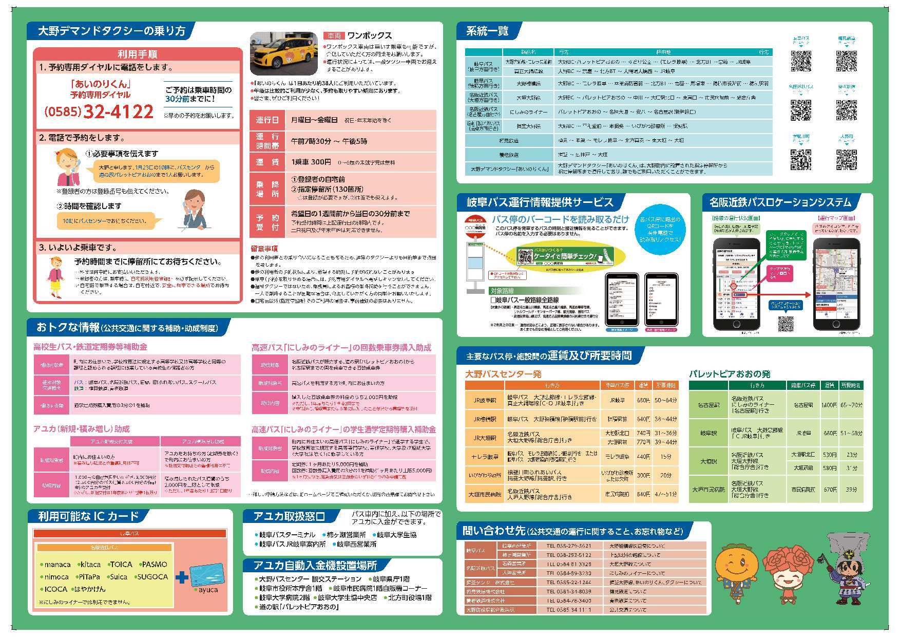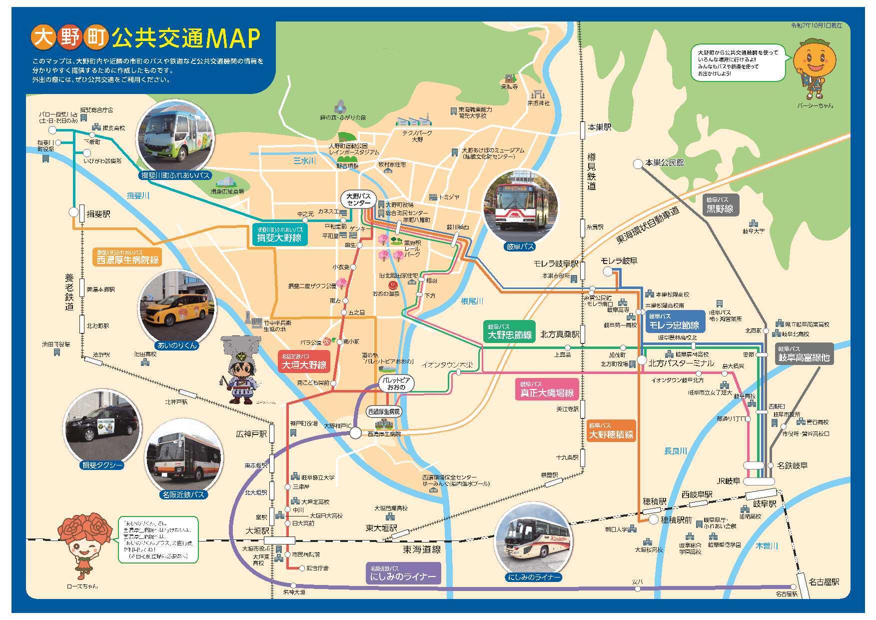 本町では、町内を運行する路線バスの運賃・路線図等の情報や、デマンドタクシー「あいのりくん」の利用方法、近隣鉄道の情報、町で実施する各種公共交通利用促進施策等についての情報を発信することで、マップを手にした方に町内の公共交通機関を気軽に利用していただくことを目的とした「大野町公共交通マップ」を作成しています。