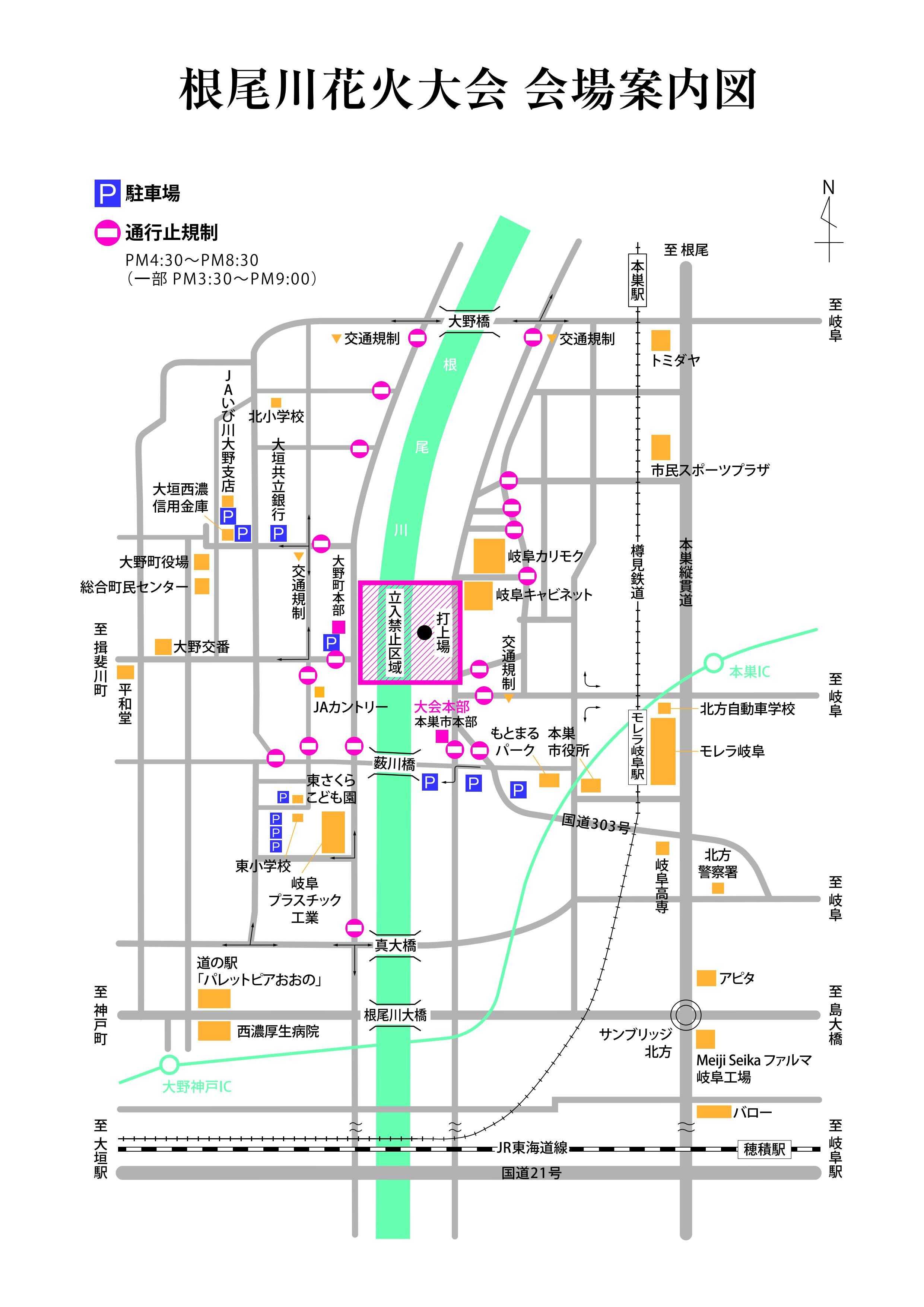 〇交通規制時間は午後4時から午後8時30分です。 (堤防道路の一部は午後3時30分から午後9時00分)