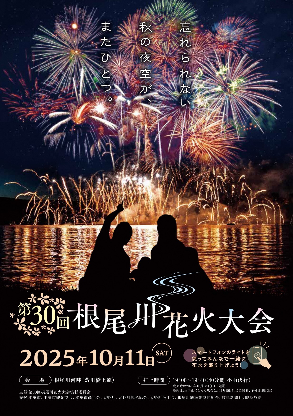 今年で記念すべき第30回目を迎える根尾川花火大会は、大野町と本巣市が地域の活性化と交流を深め、更なる発展と地域住民が「心豊かに生きること」を願い実施されます。秋の夜空で繰り広げられる華やかな花火をご覧いただき、思い出に残るひとときをお過ごしください。令和7年10月11日(土) 午後7時00分から7時40分