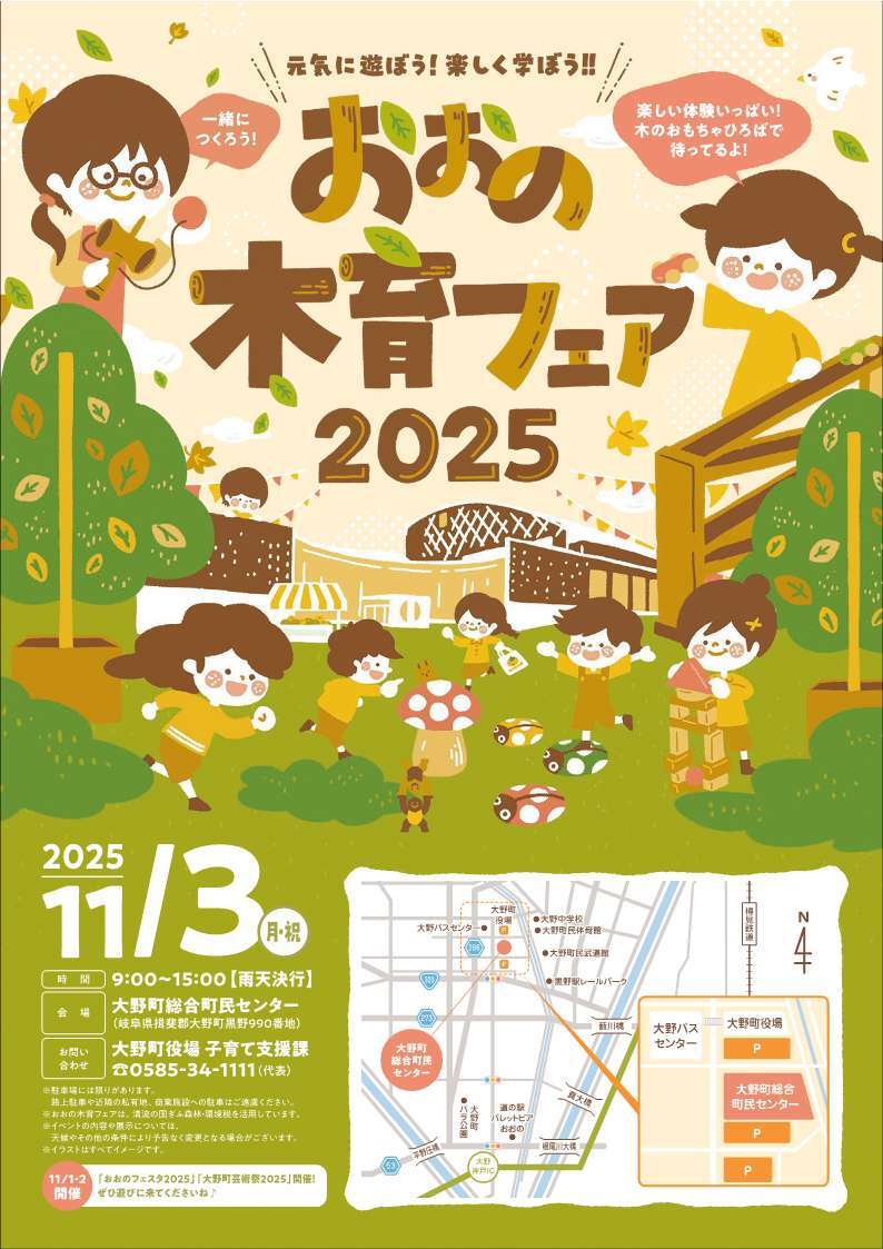 大野町では平成27年度に開催した「第39回全国育樹祭」を契機に、森林や木の恵みに感謝するとともに、こどもをはじめ全ての町民が「木とふれあい、木に学び、木と生きる」をテーマとした木育の取り組みを進め、人と森林との関わりを主体的に考えられる人づくりを目指すため、子育て世代を中心に、町内外の多くの方が参加できる「おおの木育フェア」を開催してきました。今年度も昨年度3月に開催した会場と同一会場(町民センター)にて、「おおの木育フェア2025」を開催することが決まりましたのでお知らせします。