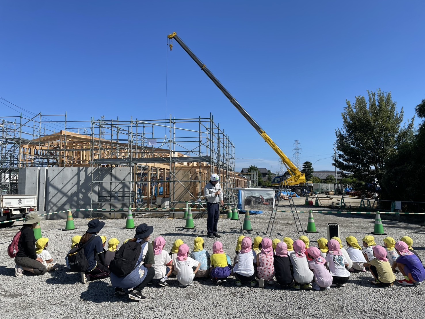 新園舎の木工事が始まり、建物全体の形が見えてきました。