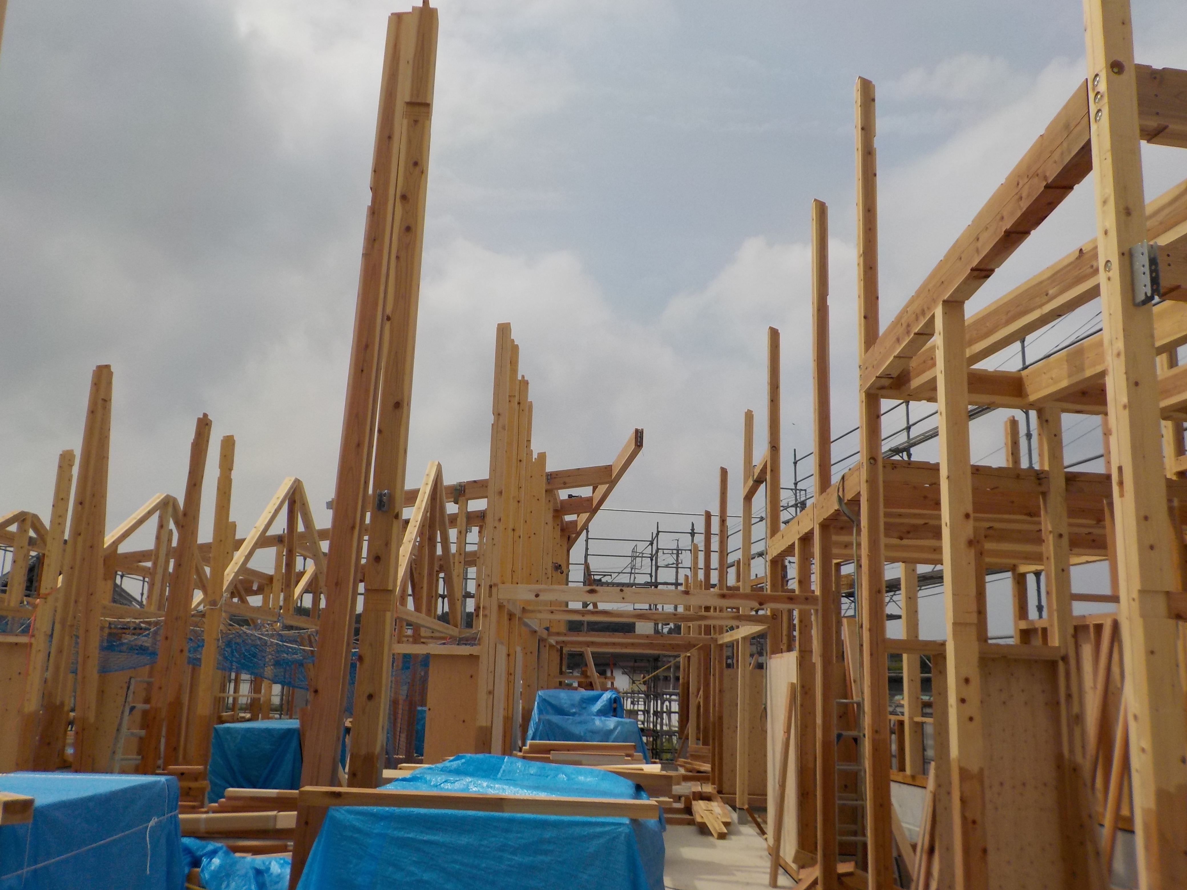 建物の骨格となる柱や梁も組み立てられています(北から望む)