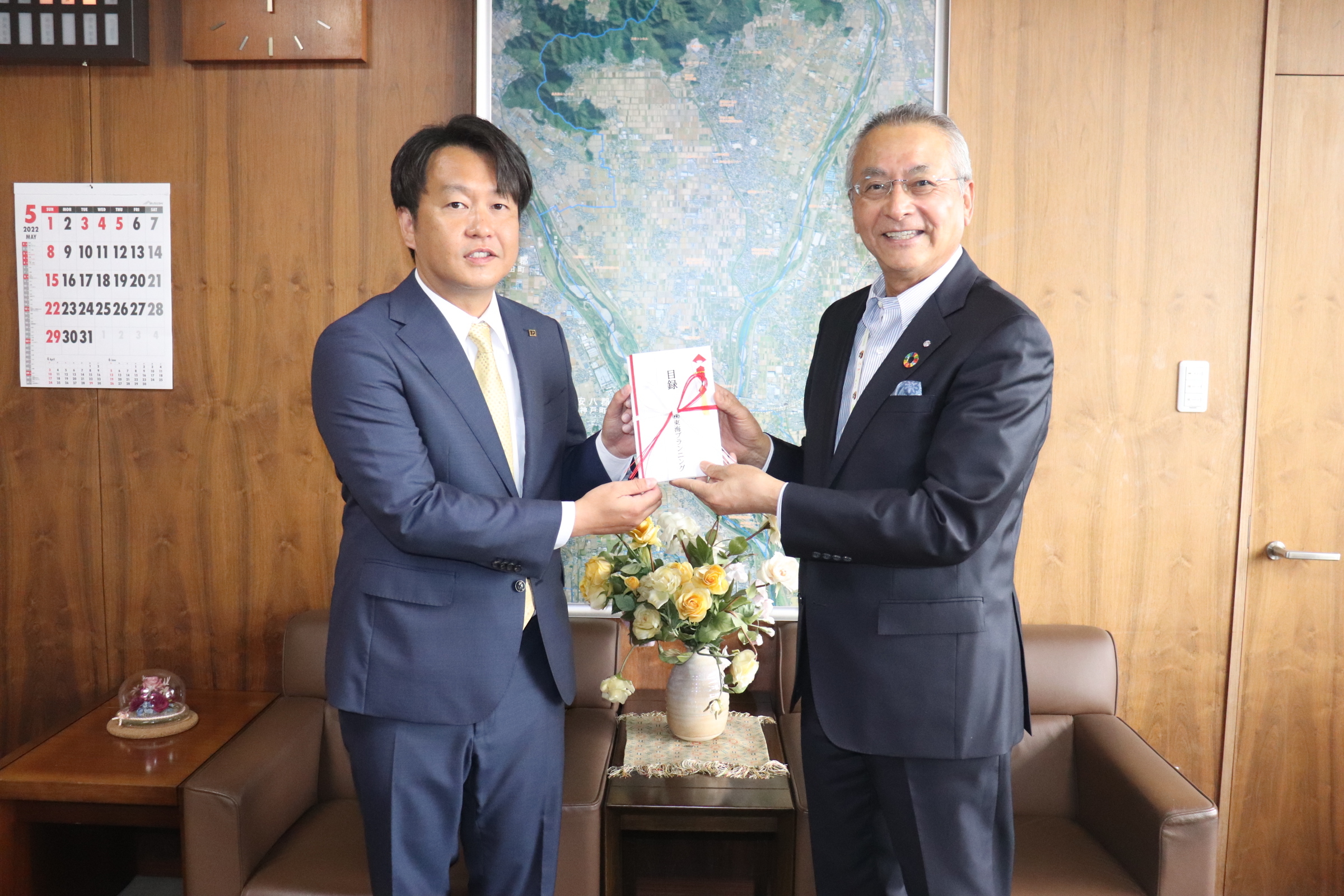 令和6年6月7日(金)に昭和造園土木(株)日比代表取締役が来庁され、企業版ふるさと納税に係る寄附目録・感謝状贈呈式を開催いたしました。