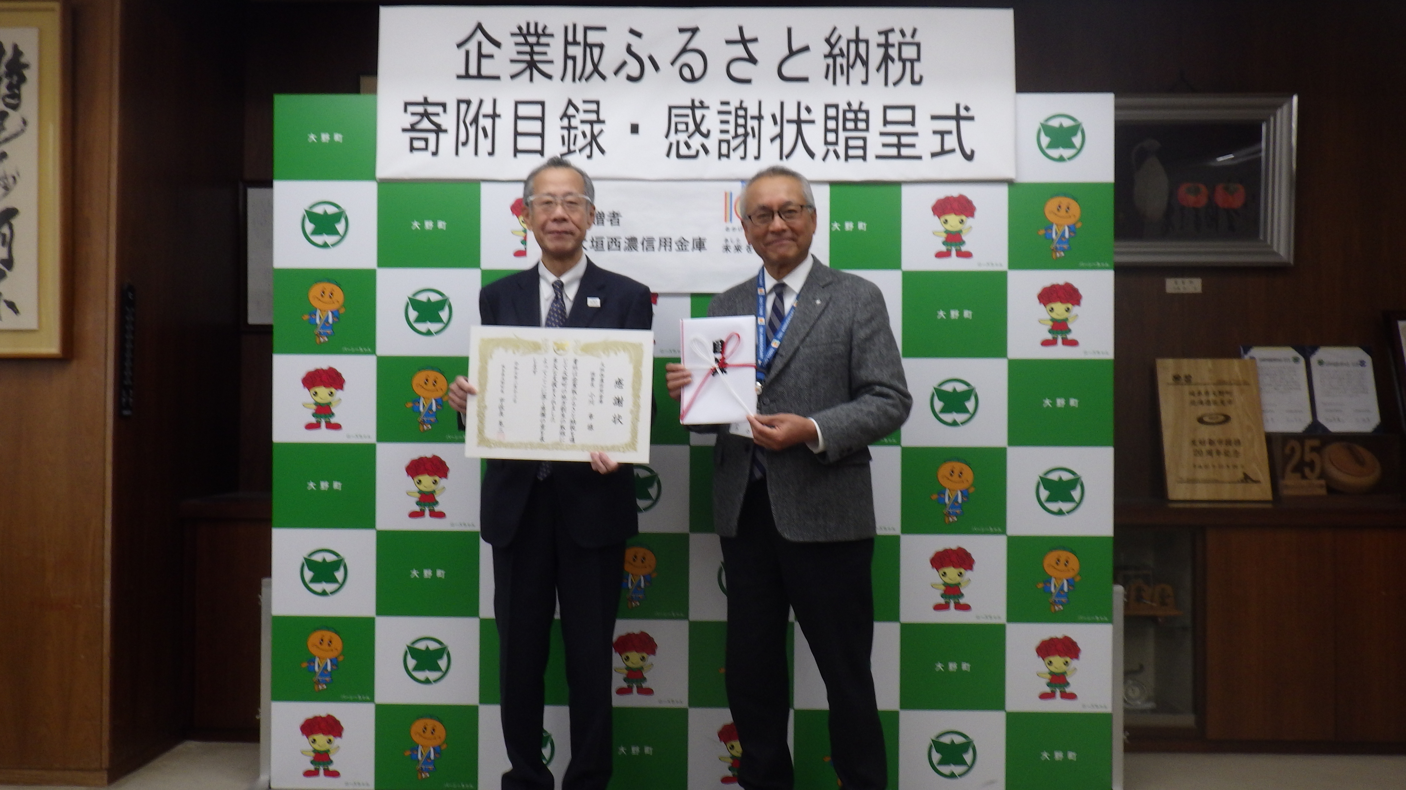 このたび、大垣西濃信用金庫様より、町の発展を願い、寄付をいただきました。