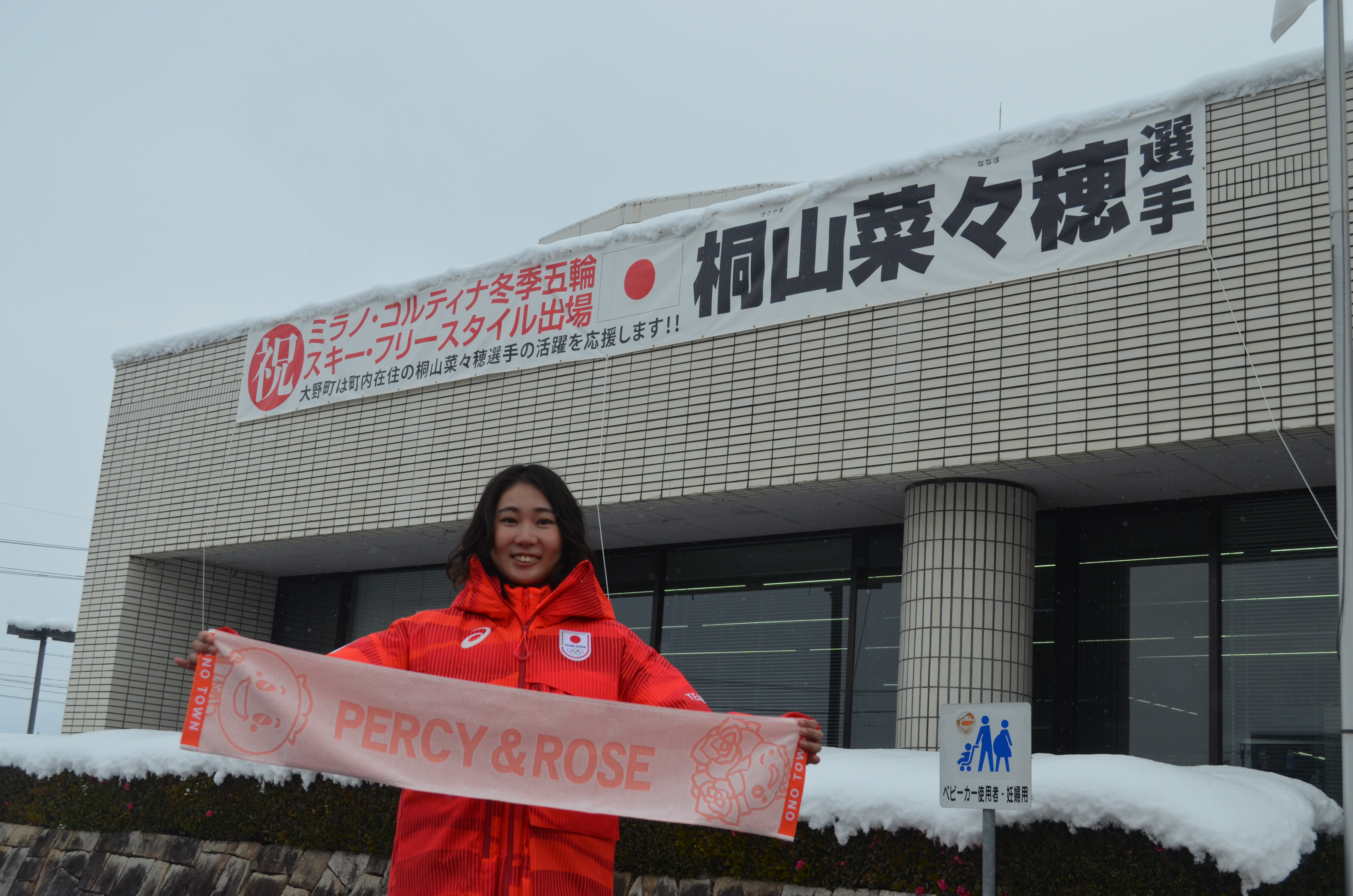 標記大会のフリースタイルスキーハーフパイプに出場する松浦透磨さん(岐阜日野自動車スキークラブ)、桐山菜々穂さん(ヒマラヤSNOWCLUB)が役場を訪れました。